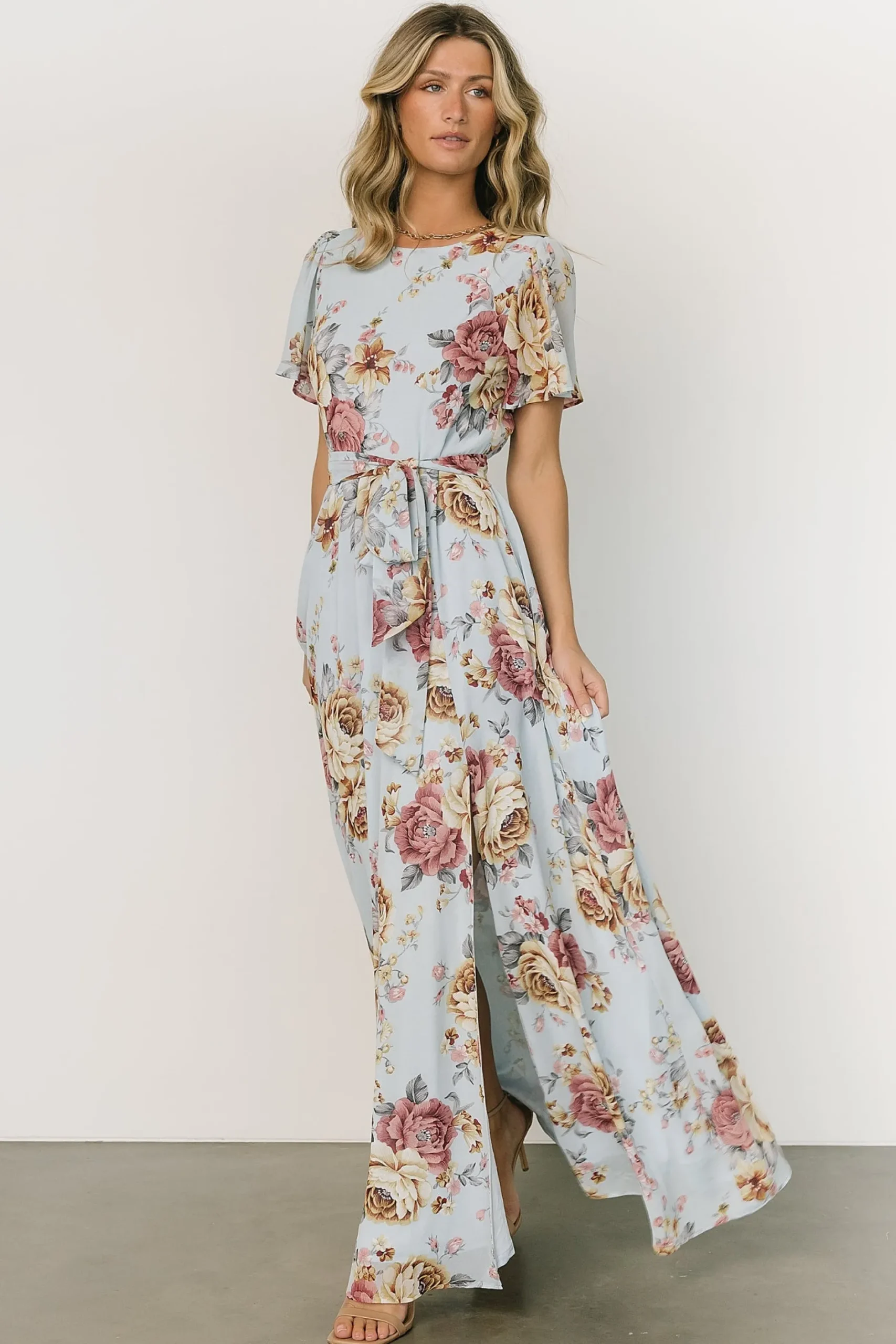 A beautiful + feminine style for any occasionLight blue with mauve and dusty gold floral printChiffon material Rounded …