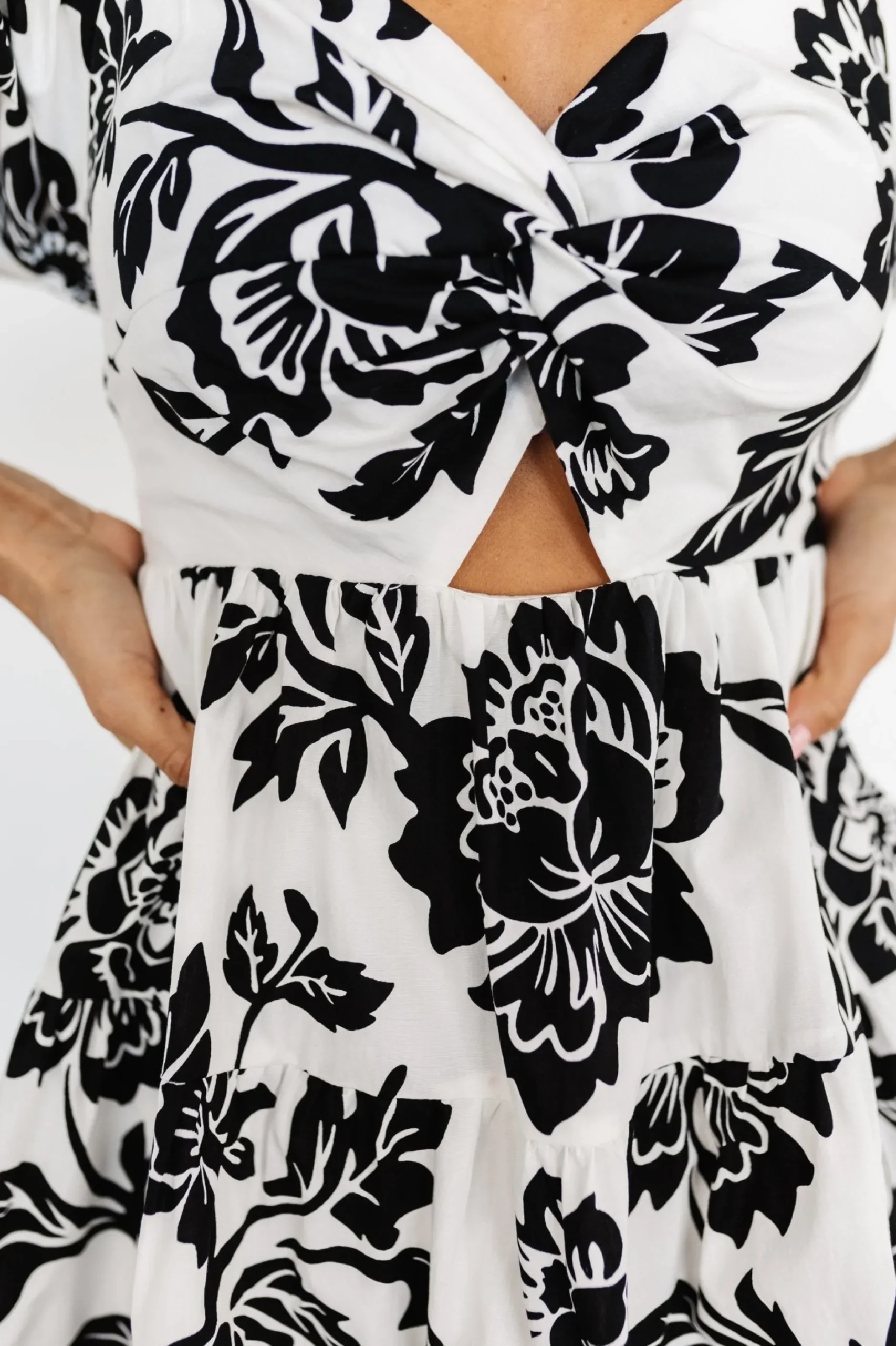 Cream/ white background with a timeless black floral printCotton material with no stretchSweetheart neckline with twist…