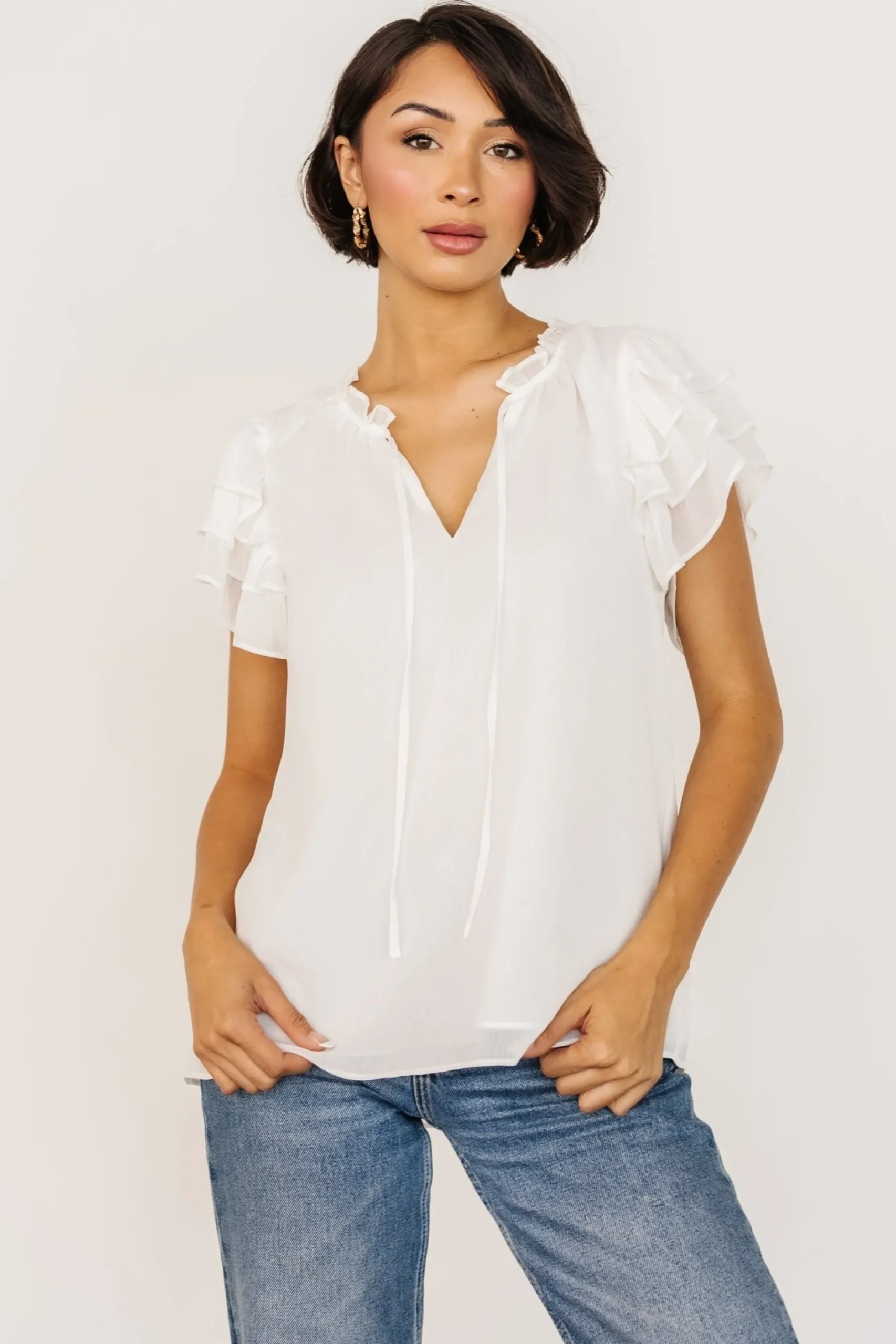 FINAL SALEOff-white colorTextured chiffon fabricV-neckline with ruffled collarTie feature at neckLayered flutter sleeves…