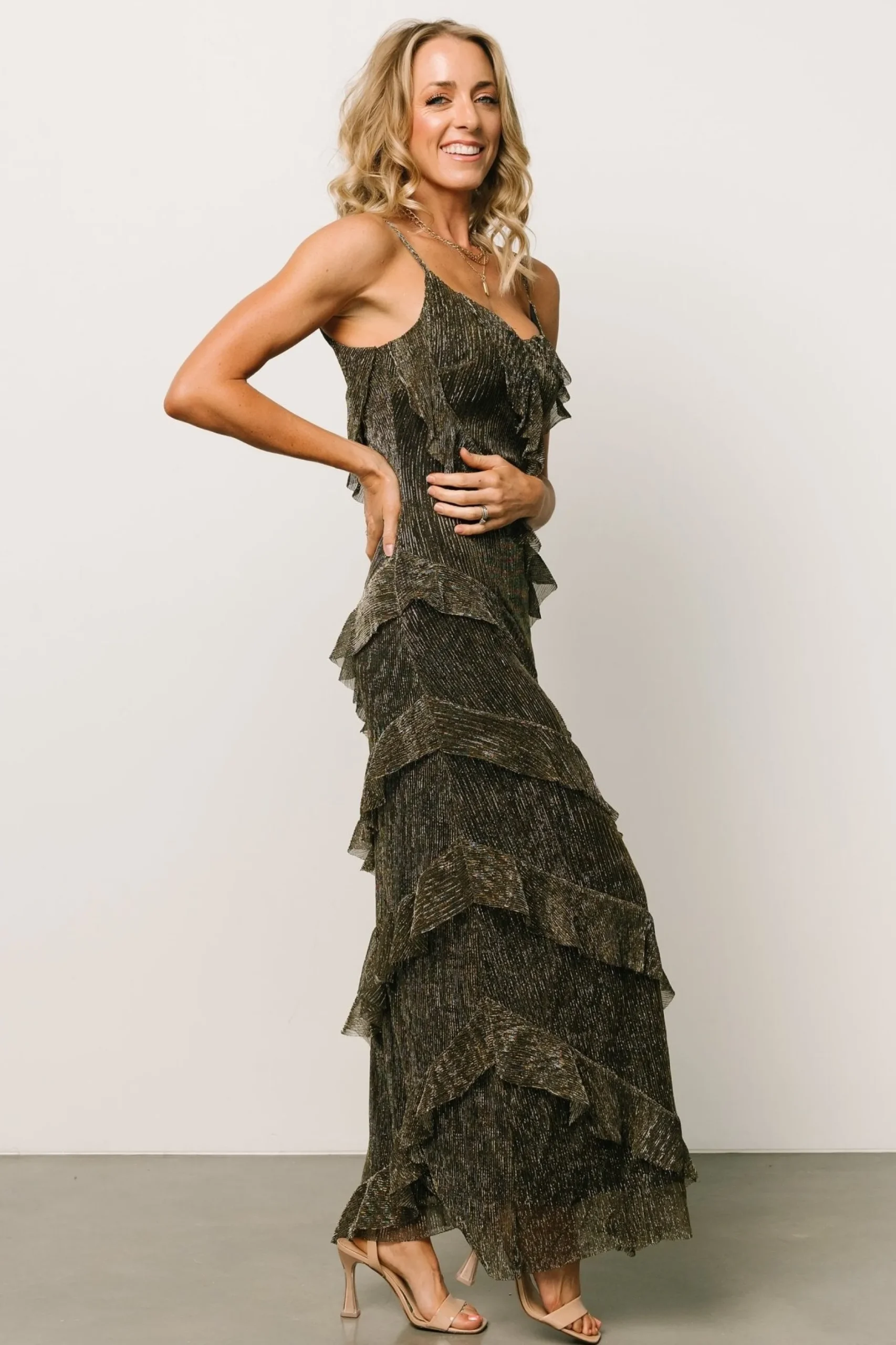 Gorgeous black and gold shade!Adjustable spaghetti straps Lurex micro pleated material with gold threading Tiered ruf…