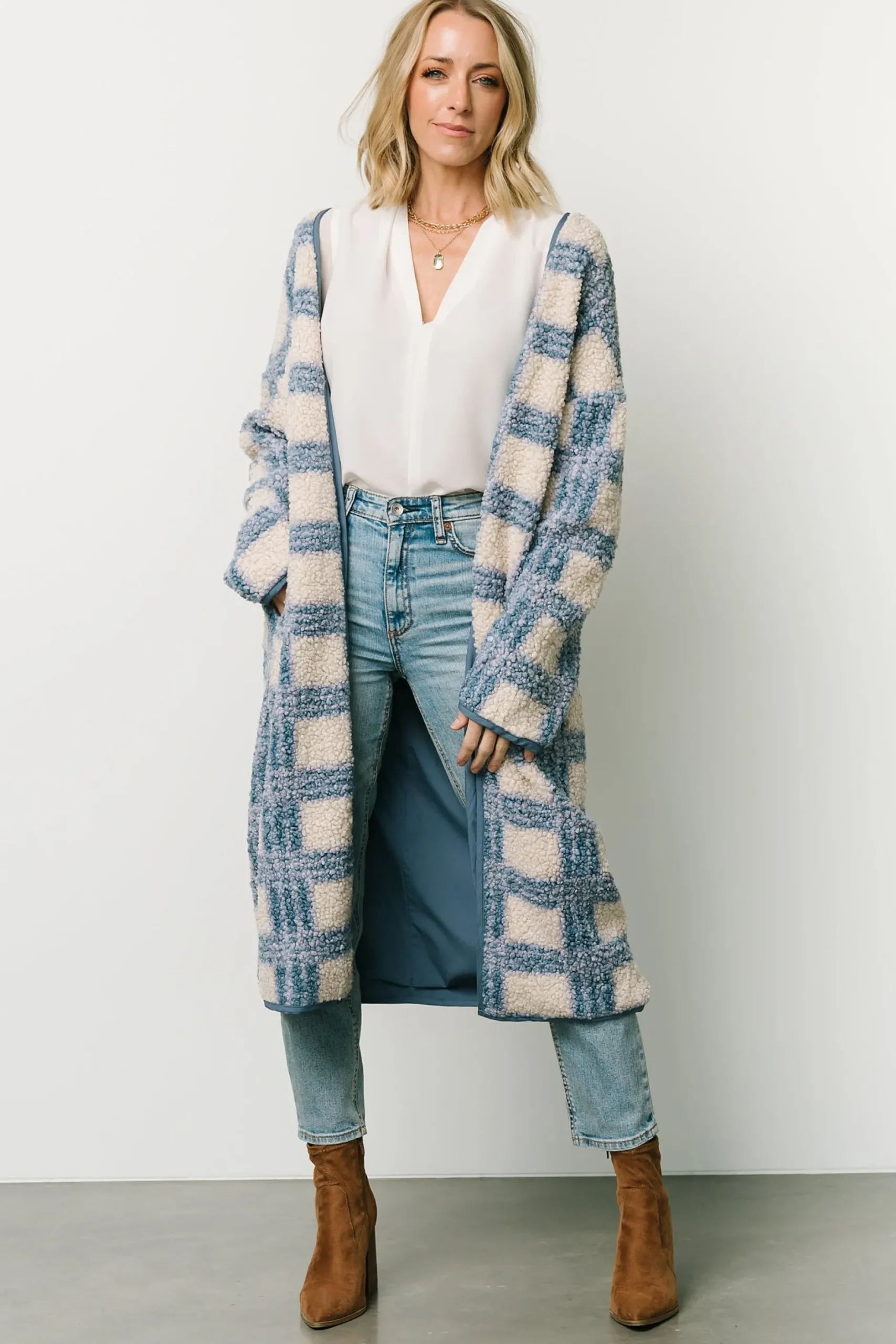 FINAL SALENeutral ivory and blue plaid patternSoft and comfy sherpa materialCrossover detail at back neckHidden pockets …