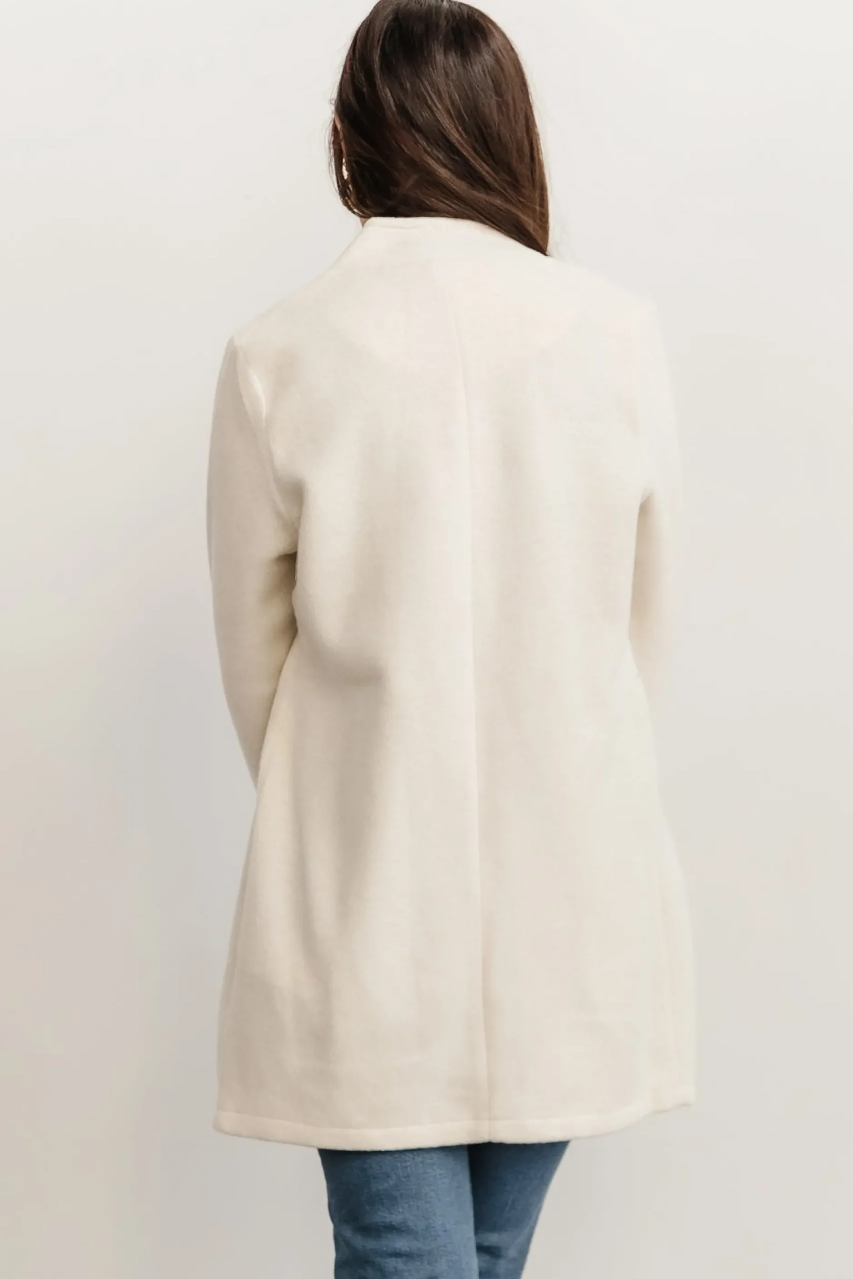 Soft ivory colored materialSlight stretch throughout fabricNotch collar at necklineLong form fitting sleevesFunctioning …