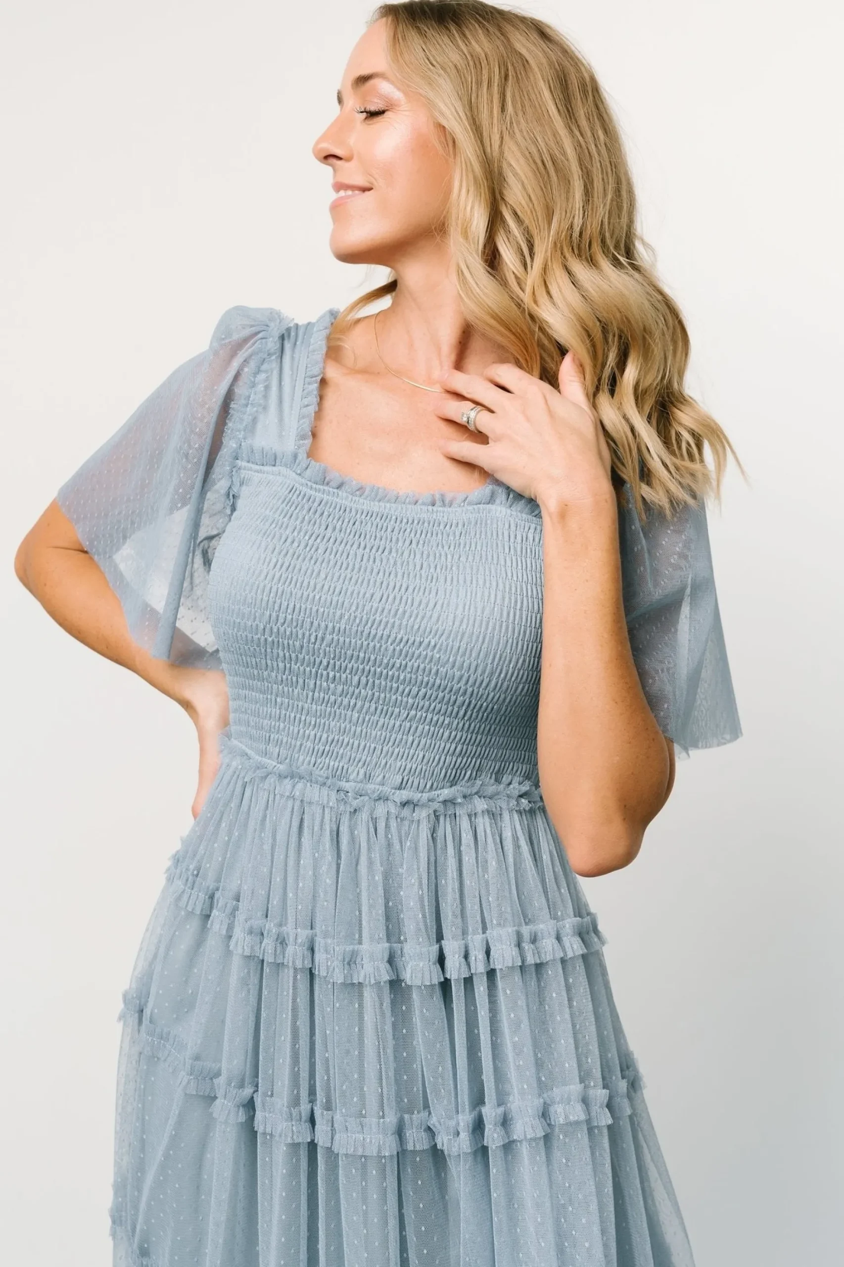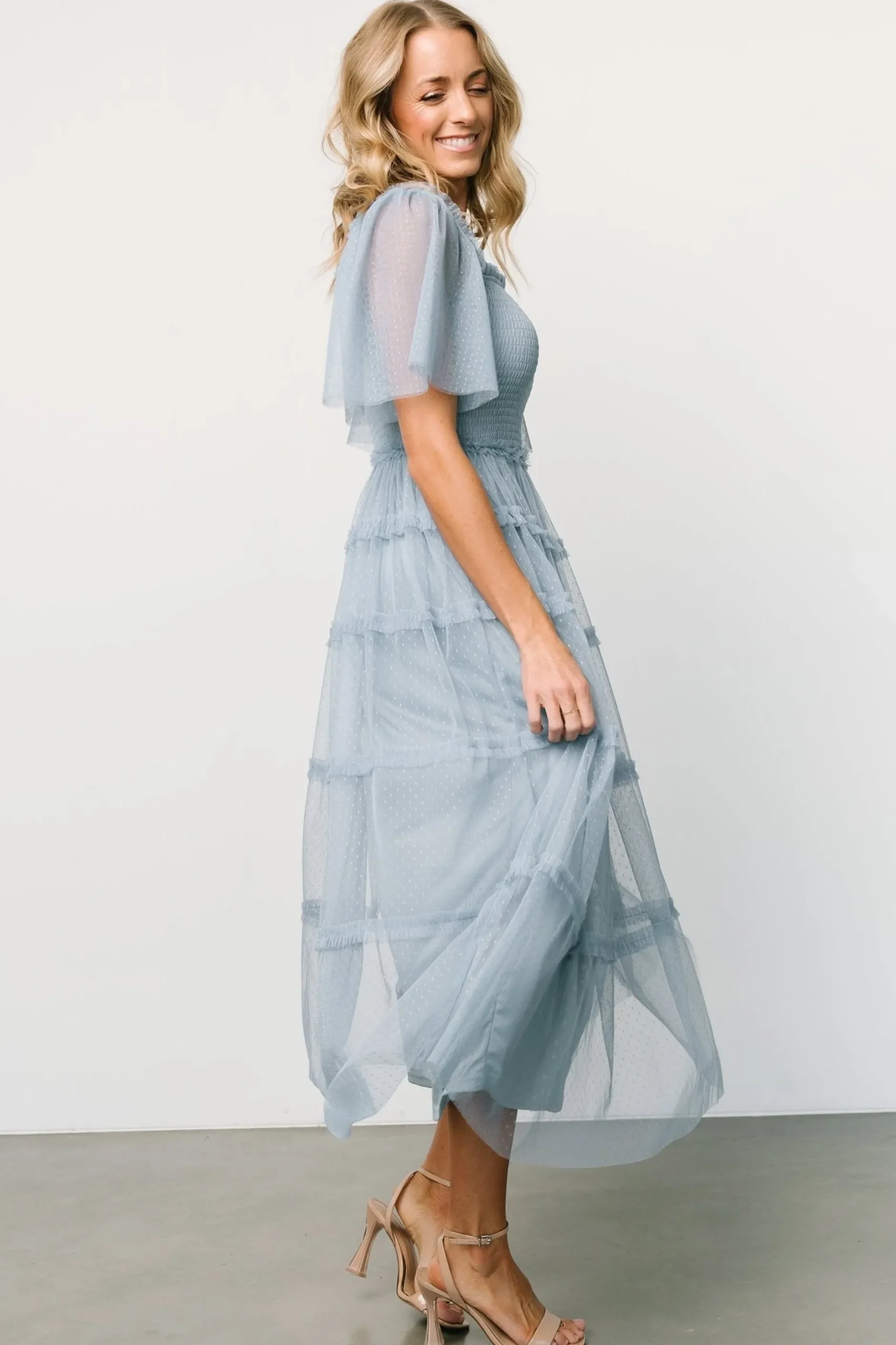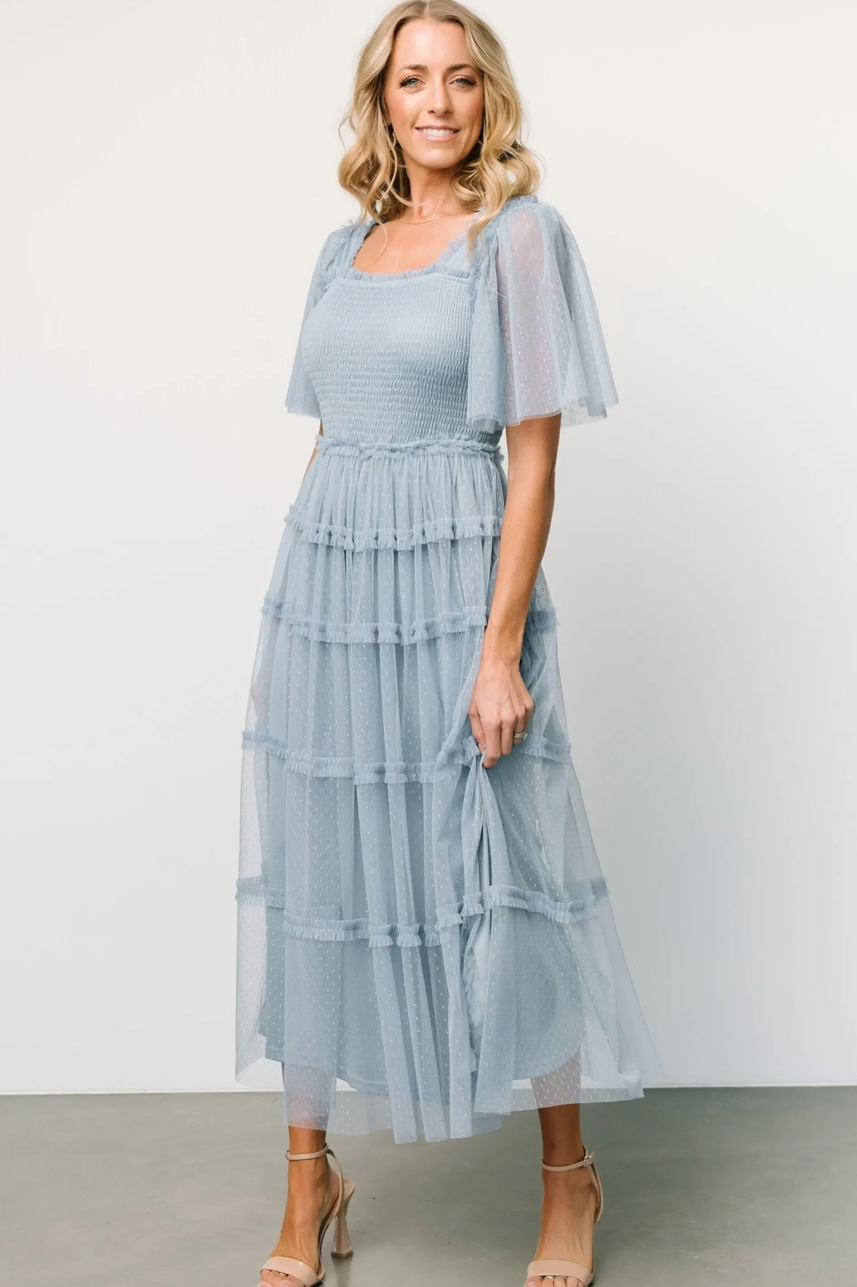 Our unique tulle dress is calling your name!Dusty blue color that pulls slateDotted tulle material draped over liningCut…