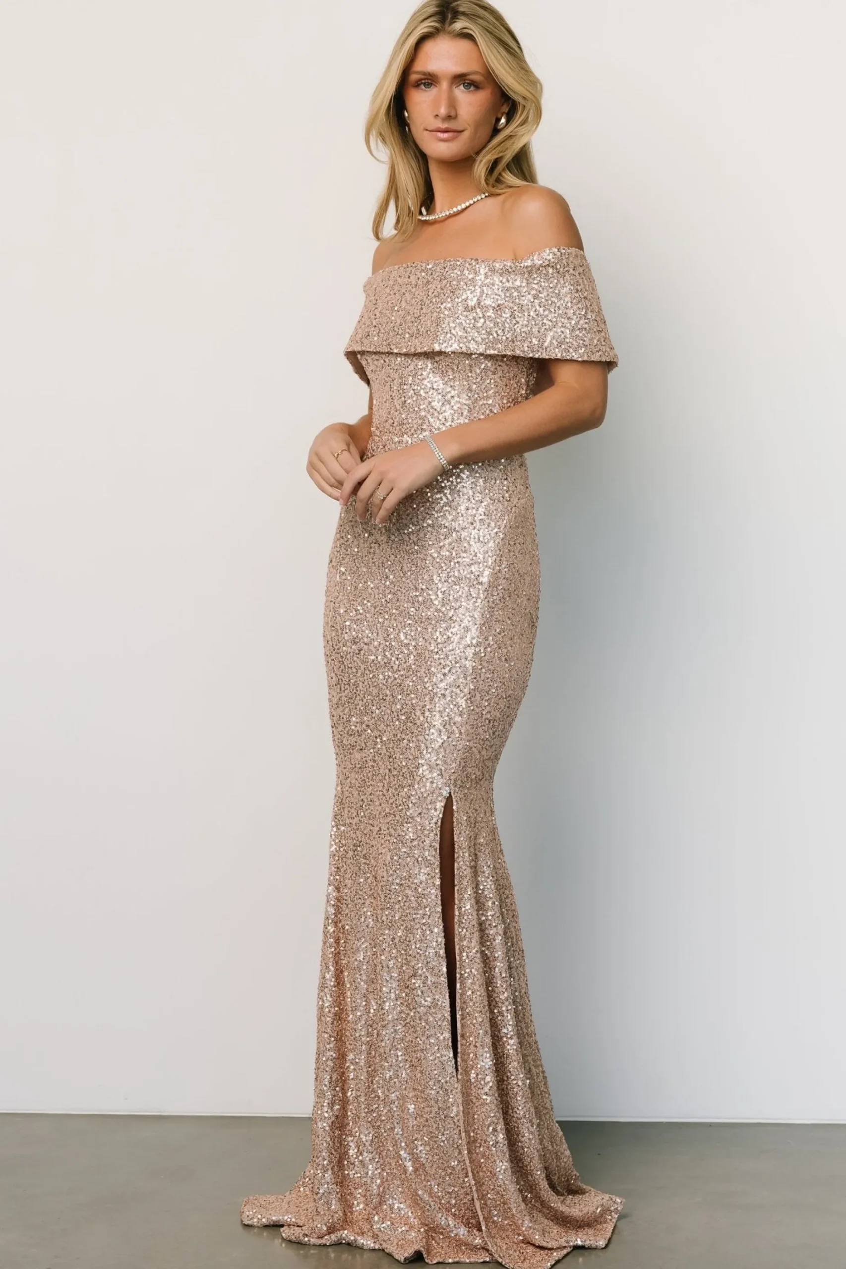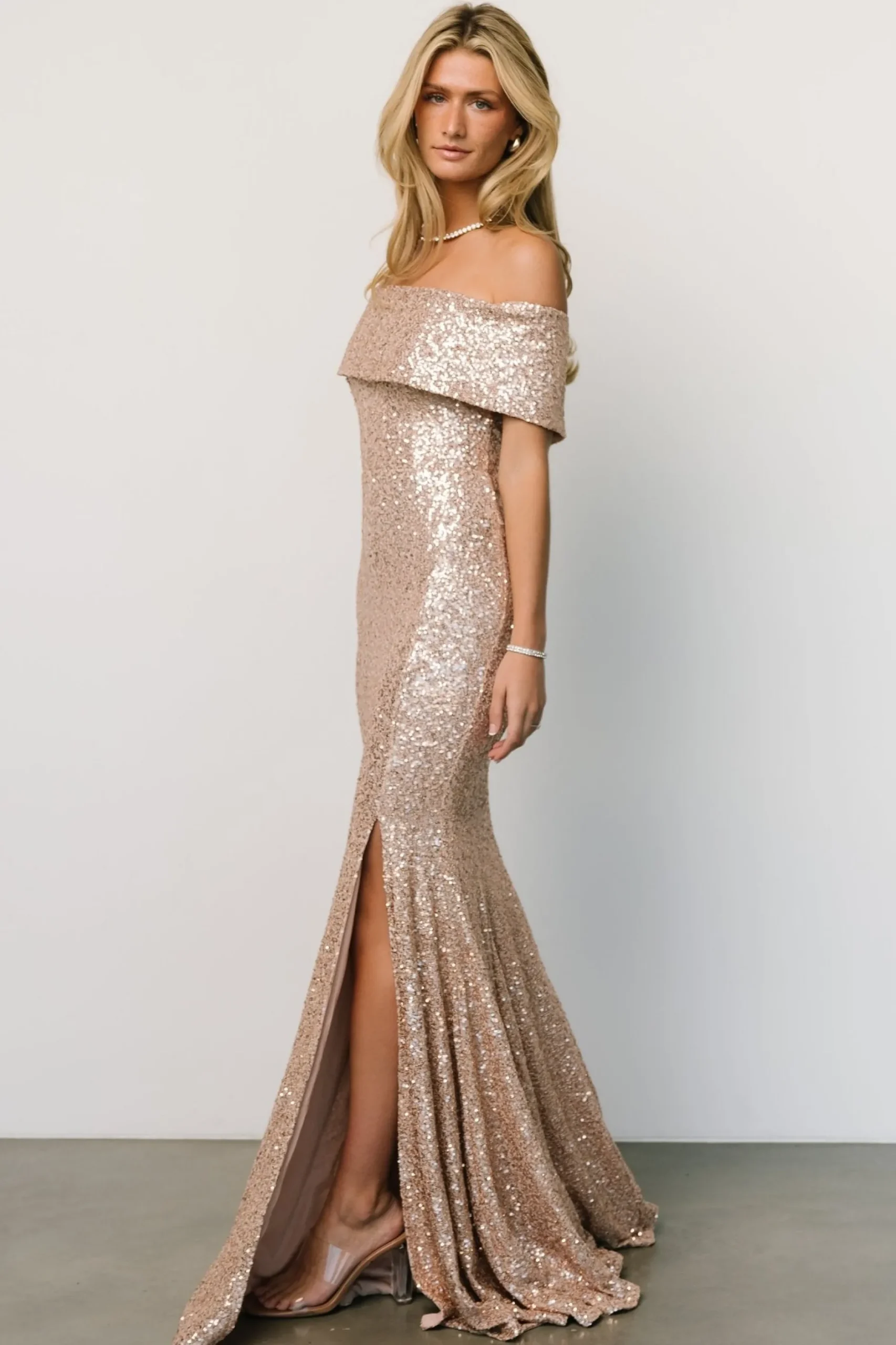 Discount Yvonne Off Shoulder Sequin Gown | embellished + sequined