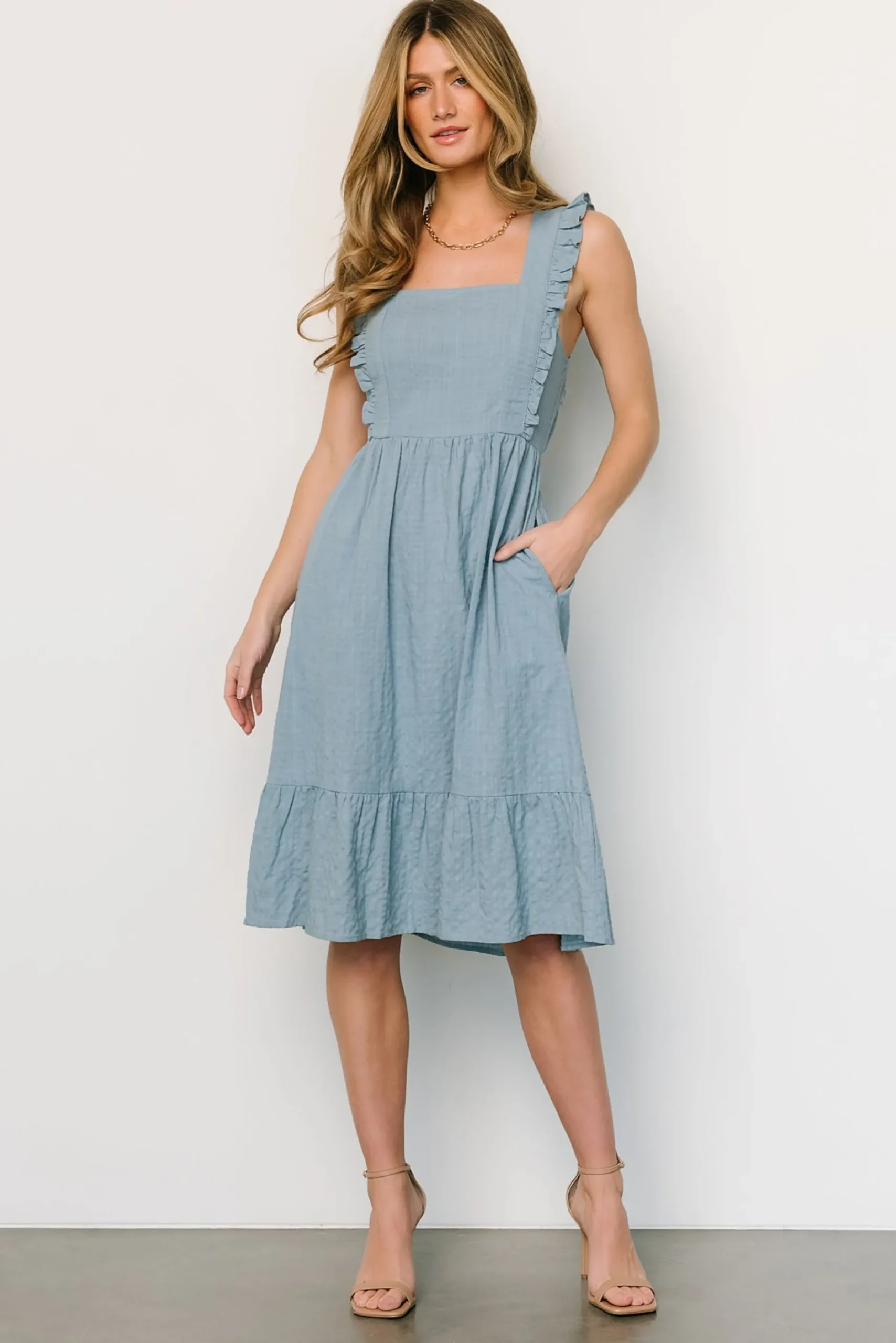 Stunning dusty blue colorTextured material with no stretchSquare necklineTank sleeves with cute rufflesOpen elastic back…