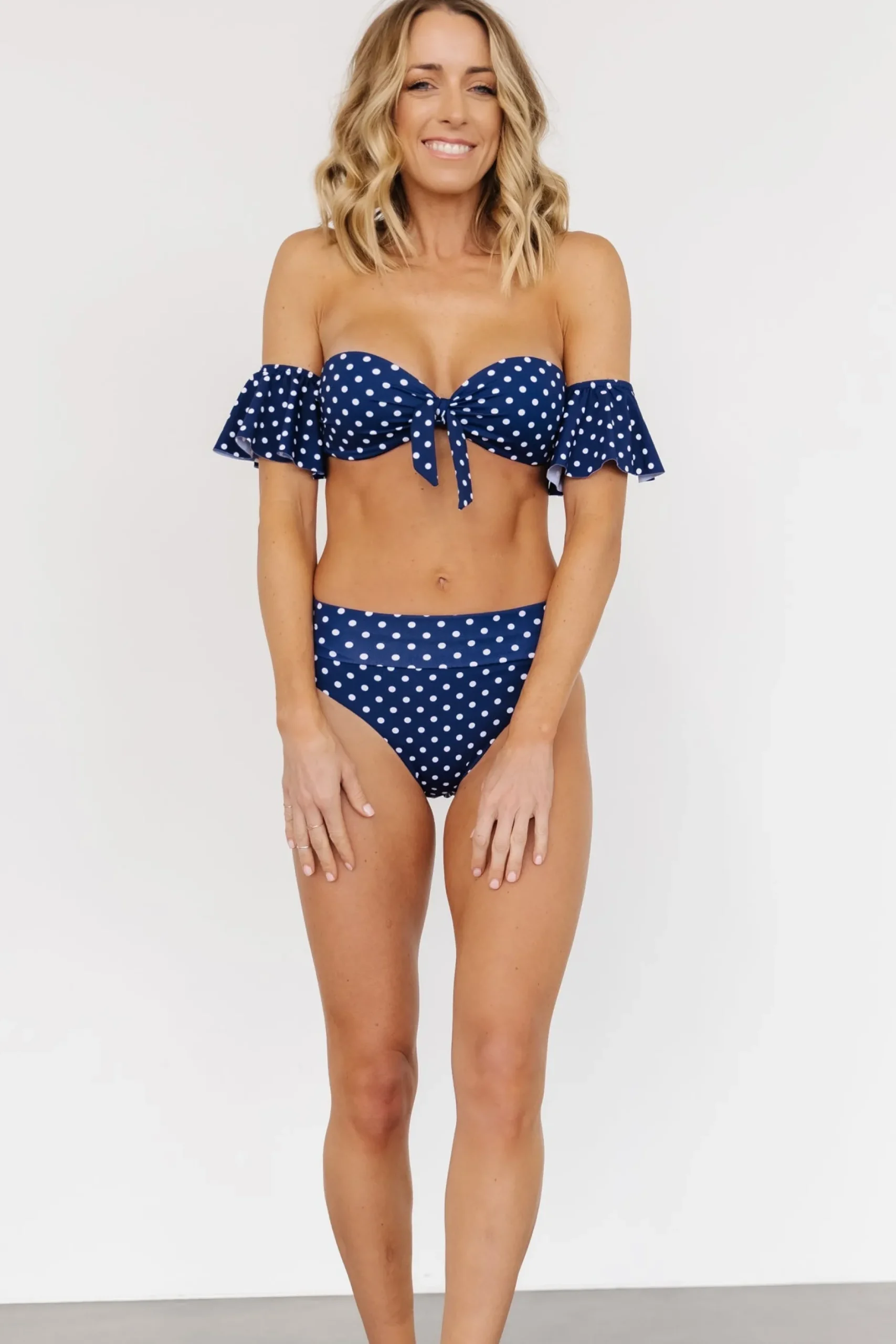 FINAL SALE. This navy polka dot bikini top is fun and flirty! The ruffle sleeves add the perfect flair to this piece!