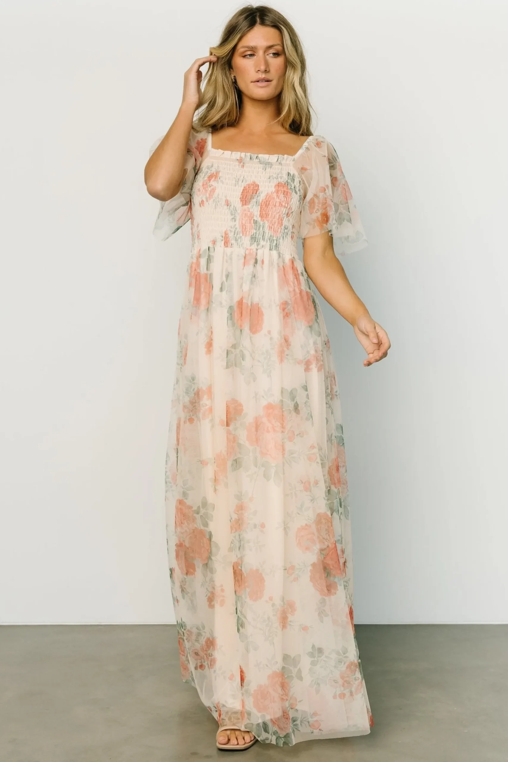 Beautiful buttercream floral with hints of green and muted red Flowing tulle materialSquare neckline with smocked bodi…