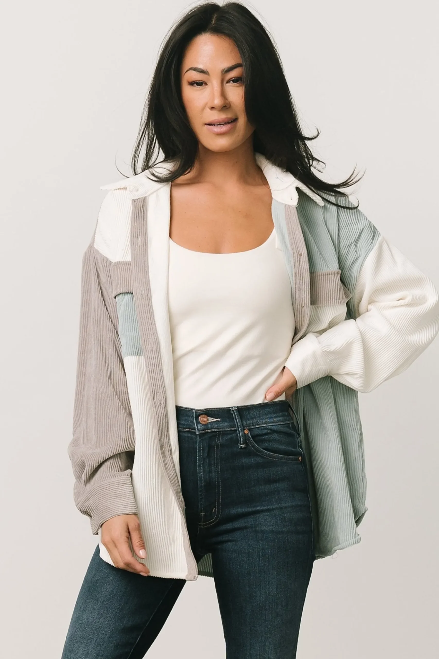 Trendy Color Block pattern of sage, gray, and off-whiteCorduroy materialFunctioning chest pocketsButton-up styleShirt co…