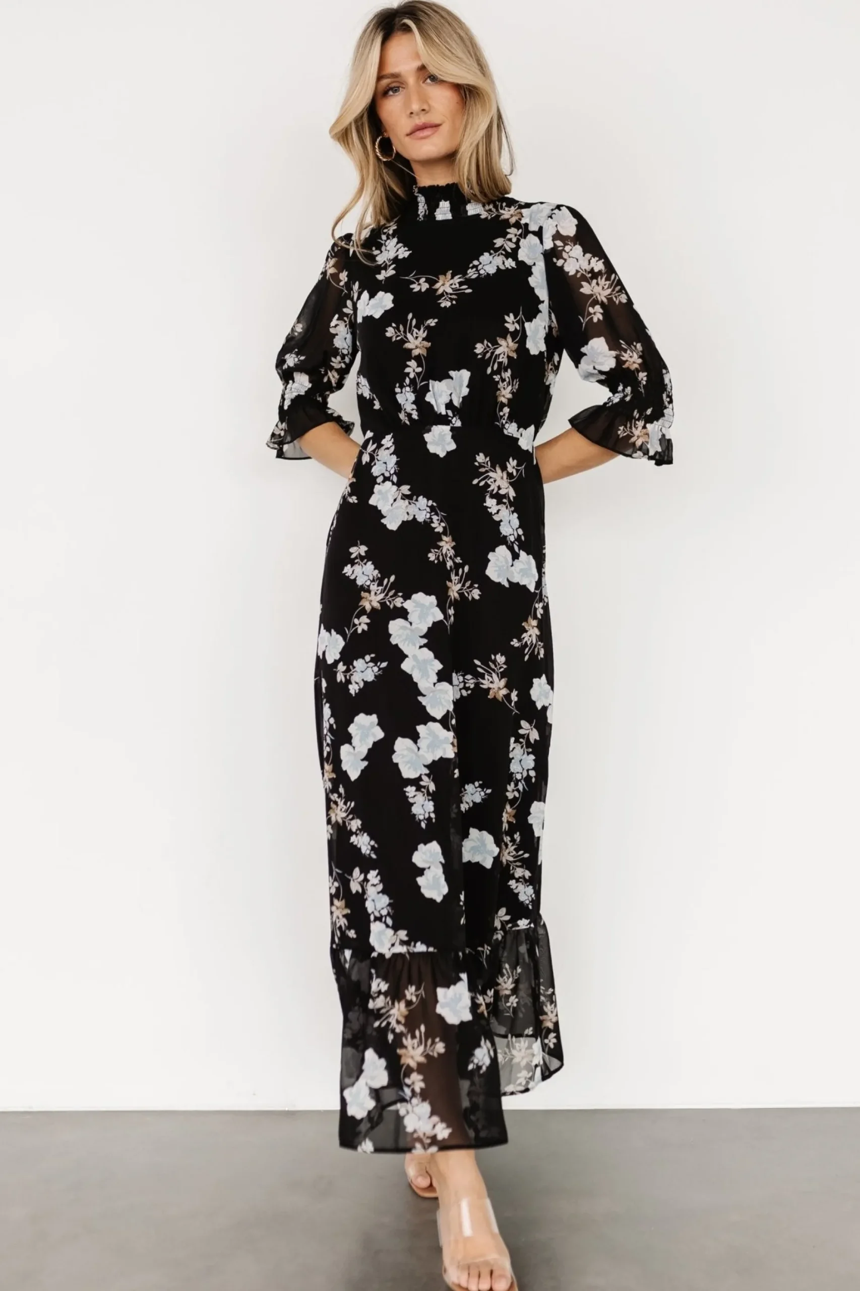 Baltic Born exclusive style!Solid black color with slate blue florals Flowing chiffon materialHigh smocked necklineKe…