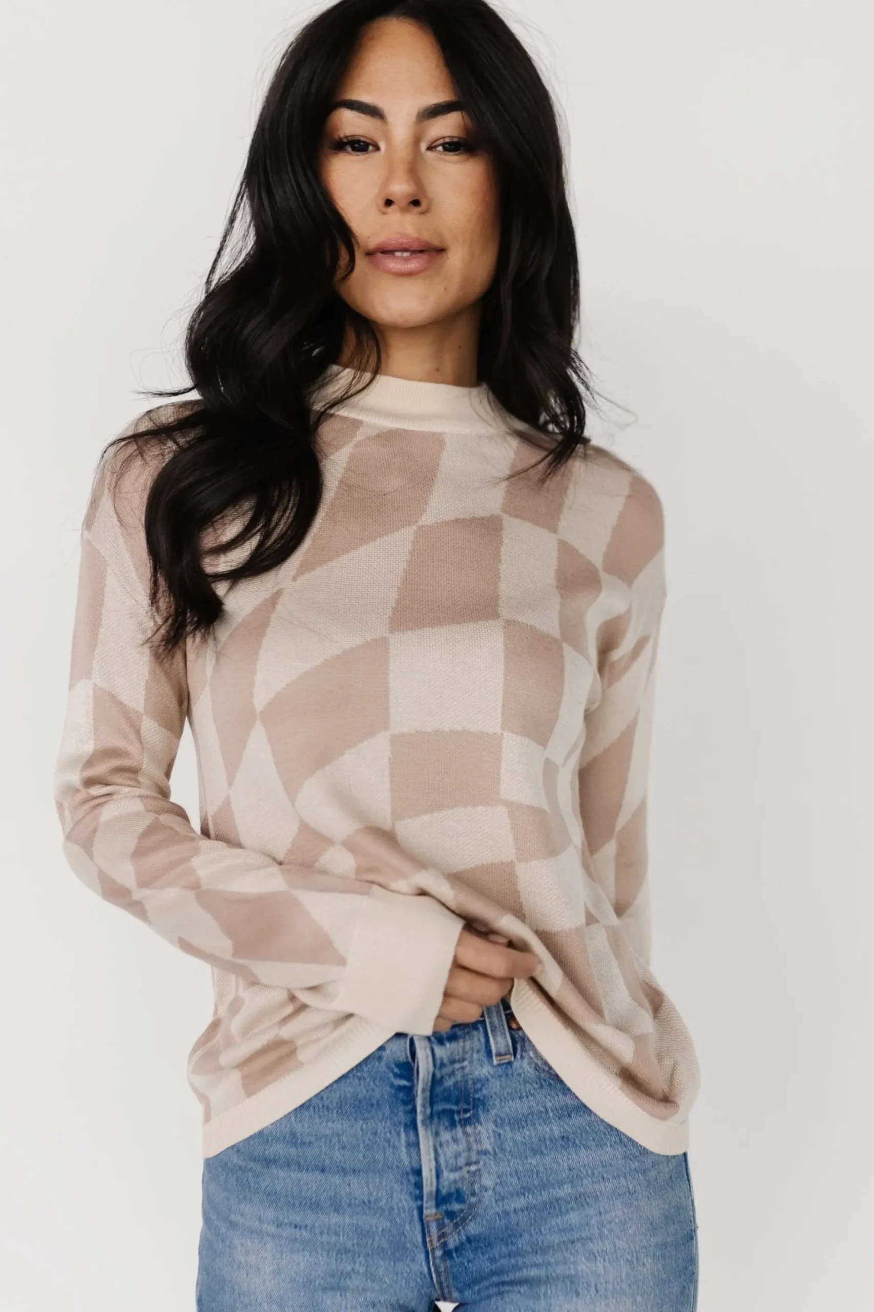 Retro sand and mocha checkered printLightweight knit material Drop shoulder hemMock neckline Comfortable relaxed fit…