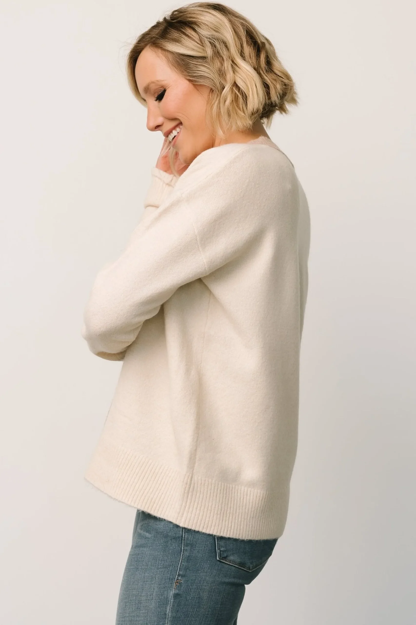 Cute cream colorTaupe and gray detailsButtery soft sweater knit materialClassic button-up styleGray overlay detail to h…