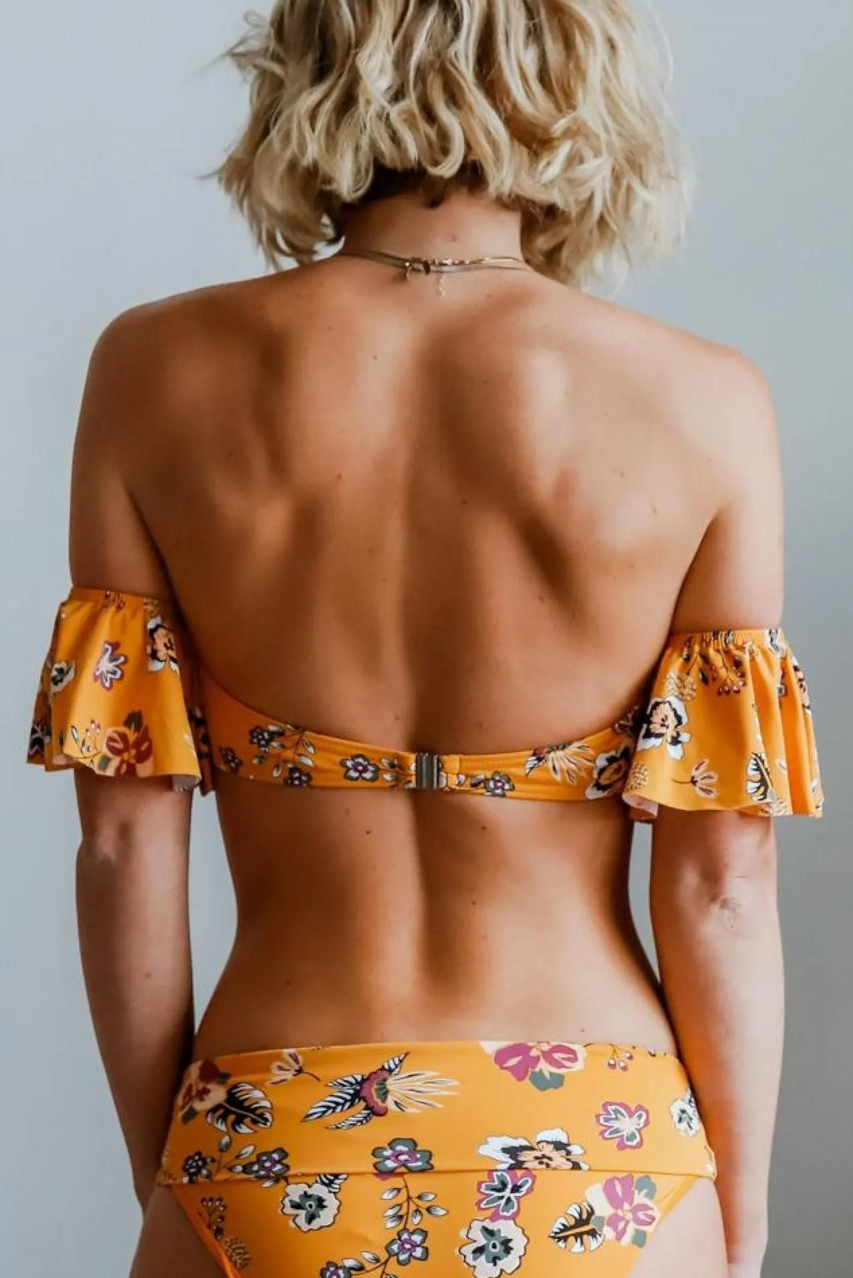 - Built in cups with attached off shoulder ruffle sleeves