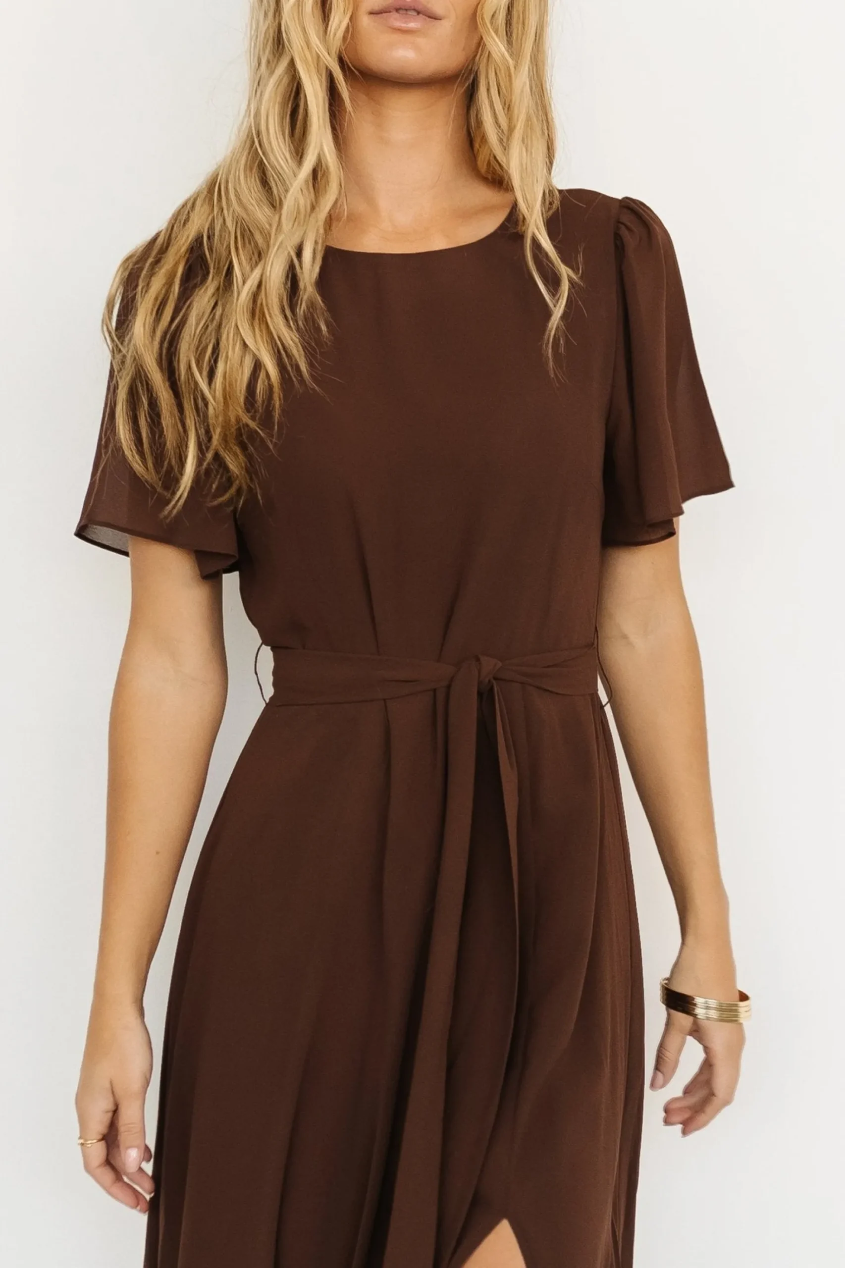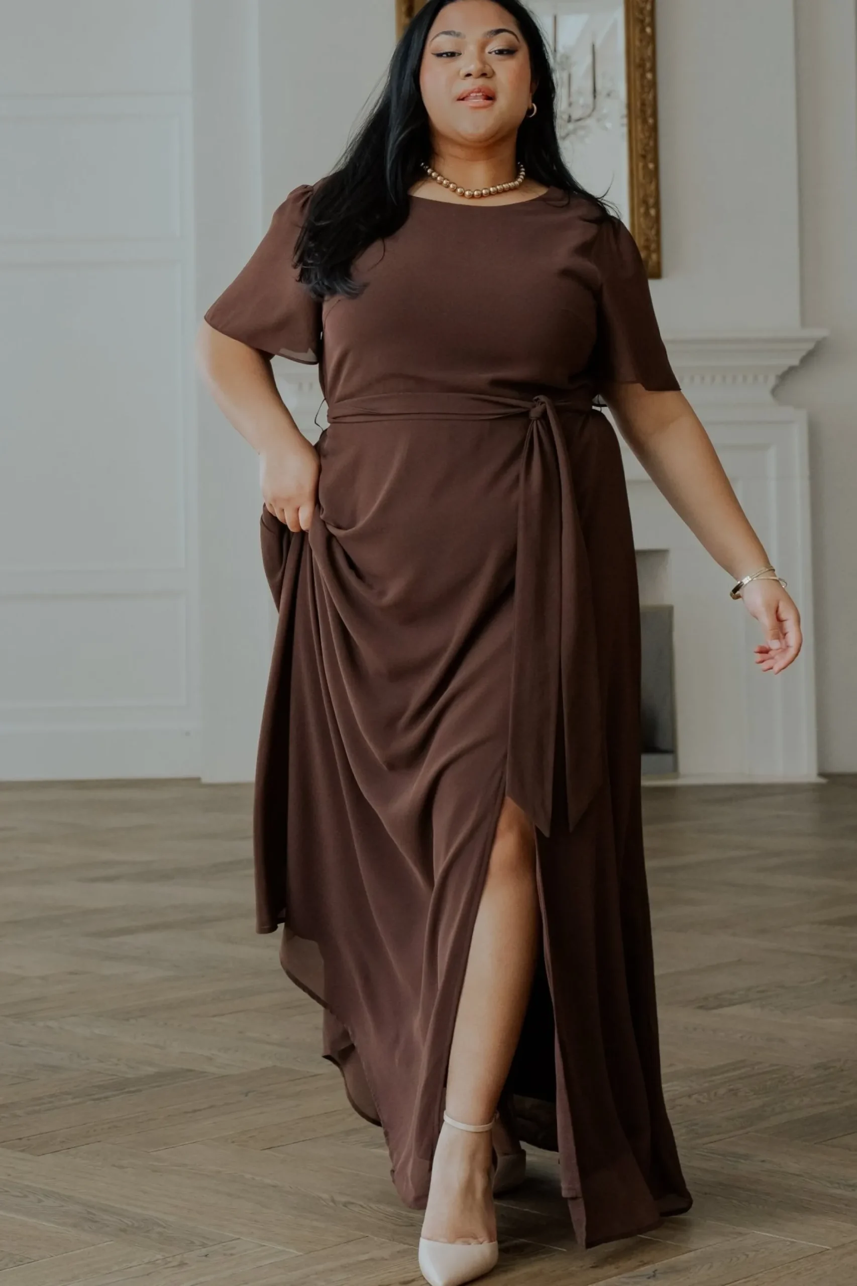 Baltic Born exclusive style!A beautiful + feminine style for any occasionLovely solid brown hueChiffon material Rounde…