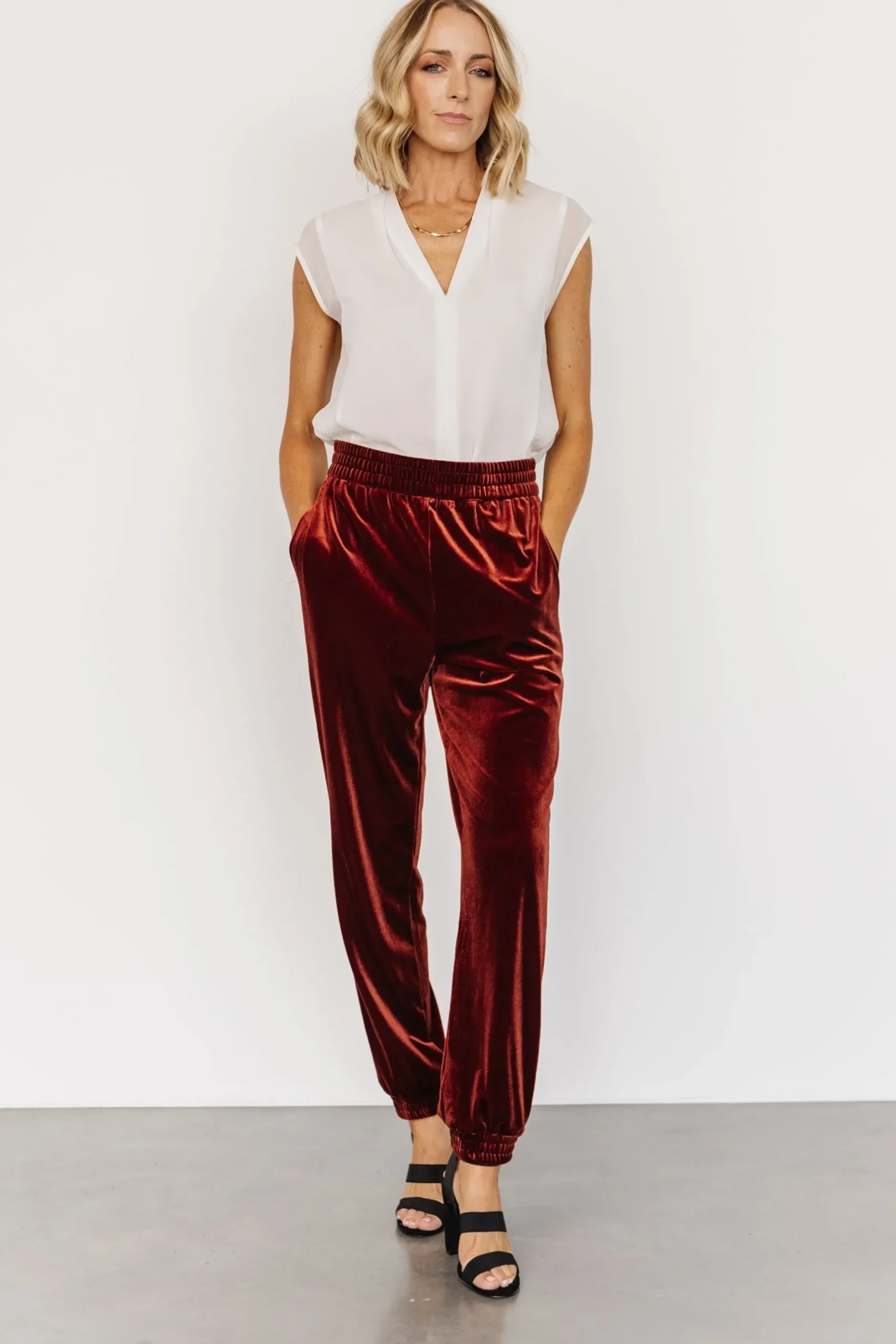 Gorgeous cinnamon hueLuxe velvet material Elastic waistbandHidden side pocketsElastic cuffs at ankle90% Polyester, 10% …